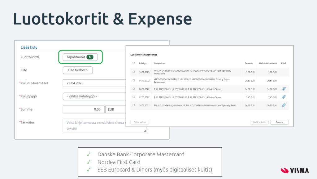 Yrityksen luottokortit voidaan myös integroida suoraan Expensen kanssa, jolloin korttitapahtumat välittyvät suoraan järjestelmään. Tämä vähentää manuaalista työtä ja varmistaa, että kaikki kulut tulee kirjatuksi oikein. Lisäksi jo muutamilla luottokorteilla on mahdollista hyödyntää digitaalisia kuitteja. Tämä tulee varmasti yleistymään ja tarjonta täydentyy tulevaisuudessa.