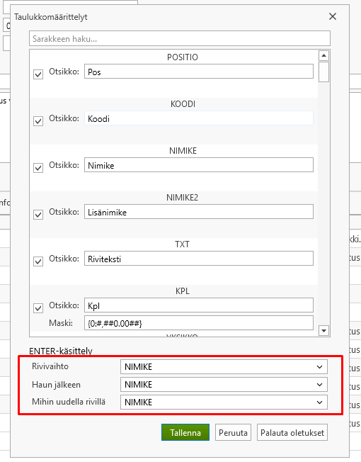 6. Enter-käsittely: Pääset muokkaamaan asetuksia valitsemalla Asetukset | Taulukkomäärittelyt. Novan rivikäsittelyssä on oletusasetukset, joiden mukaan haluttuja asioita tapahtuu, kun painat Enteriä määrätyssä sarakkeessa.