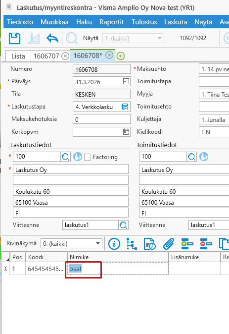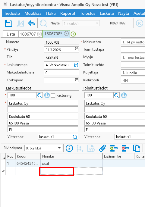 • Laitetaan Nimike kenttään osat, niin hakee koodin ja sitten kun uudestaan painetaan Enteriä, niin siirtyy seuraavalle riville Nimike kenttään.